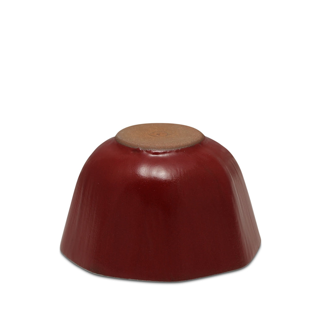 The lacquer red glazing is rich and attractive, and beneath the solid appearance from a distance, subtle ripples keep the surface interesting and hint at the dark underlying material.