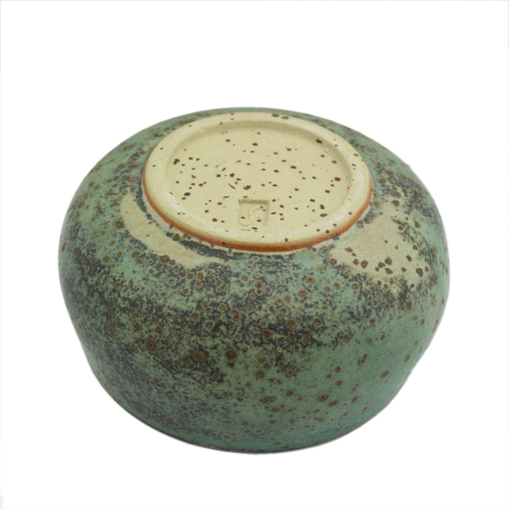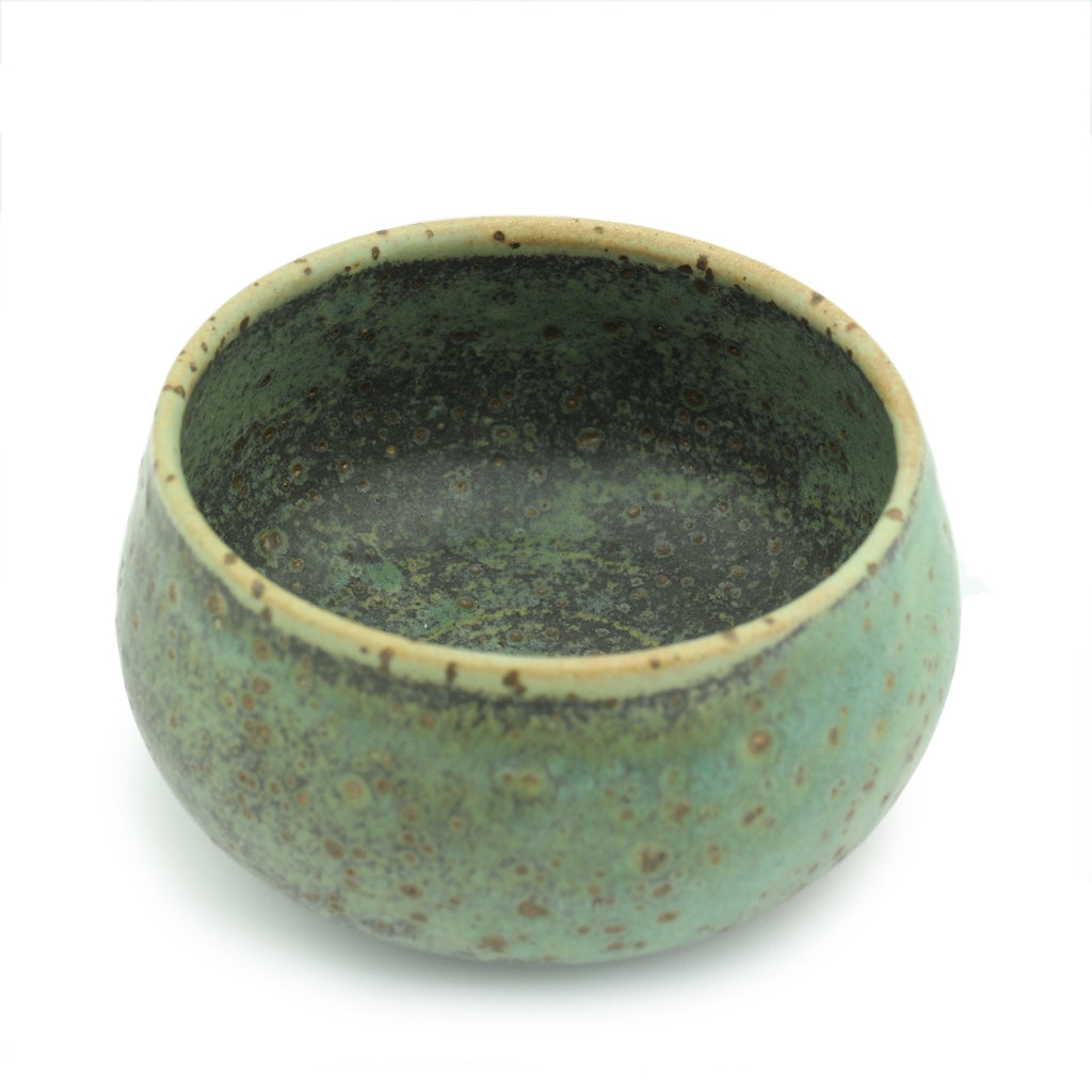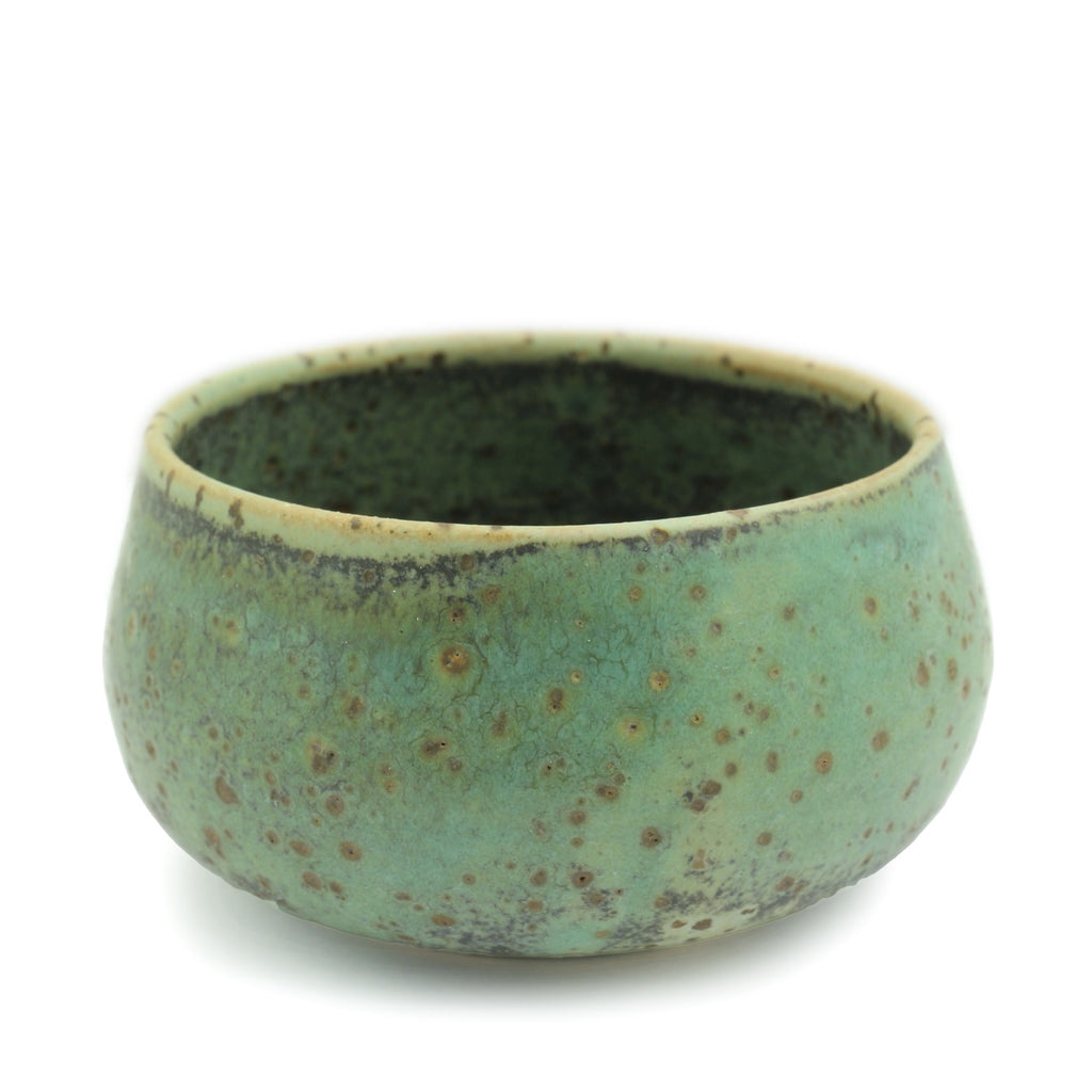 These low, deftly-canted teacups are understated beauties to grace your tea table. The patchy teal and gray glaze, bespeckled brown, recalls a lichen covered stone nestled in the undergrowth of northern forests, yet the underlying material, revealed in the unglazed ecru foot, and tapering walls render them surprisingly light in the hand. At around 100 milliliters, they're the perfect size for one to two gongfu cha drinkers to enjoy tranquil teas—perhaps those with a good dose of woody, soil, or mineral notes.