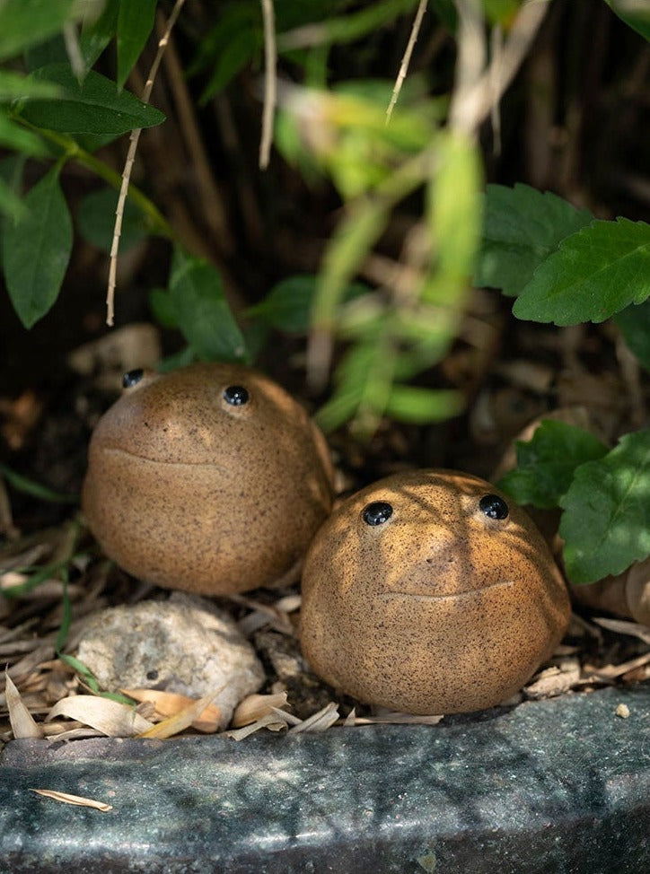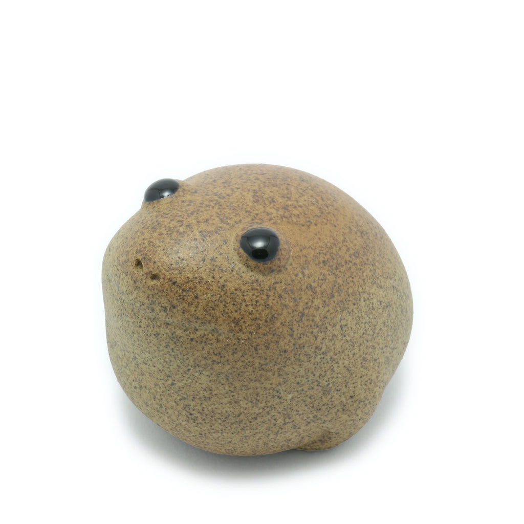 Perfectly at home in a moist environment, a frog is a good choice of figure for being bathed in discarded tea; the lucky icon of Jin Chan a.k.a. Chan Chu, a three-legged frog surrounded by coins found in East Asian shops worldwide—and therefore tea shops—is doubly apropos. An amusing twist, then, that the designer has chosen to reimagine the traditionally fearsome and ornate iconography in favor of a Jin Chan that more resembles a puffed-up rain frog. Made of speckled clay with large black eyes, this tripod companion is sure to be a cute accompaniment to your gongfu cha sessions.