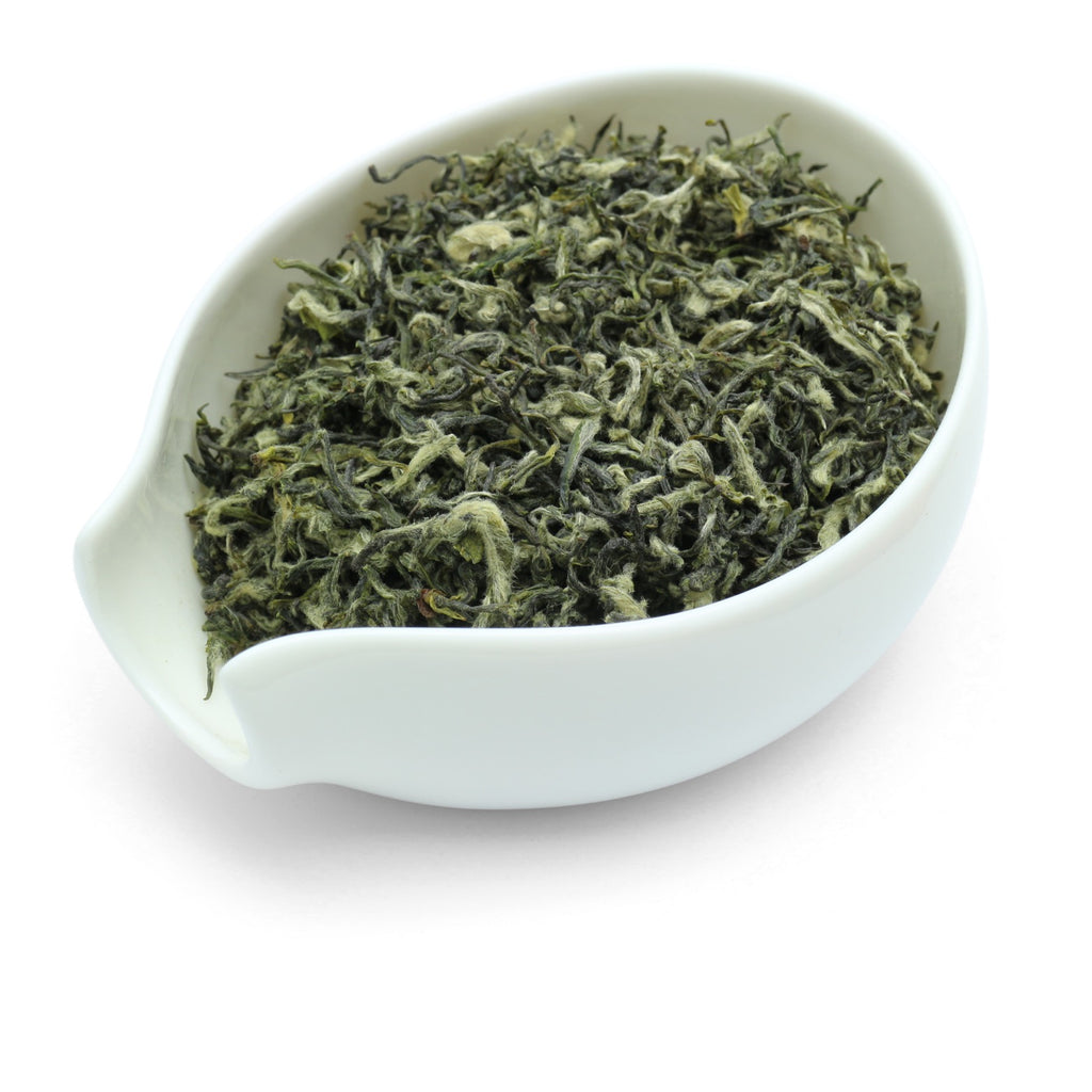Originating near the city of Suzhou, the tiny curls and deep colour of this style lent it its charming moniker. Opening its container quickly may send forth a cloud of pale fuzz: the shed trichomes of the young tea buds, a marker of quality in this and many teas. The light and cloudy infusion they produce wafts a delicate balance of tropical and temperate fruits—pear comes to mind—raw cashews, and the brothy flavor of steamed bok choy. With its complex profile, pleasing astringency, and a lingering aftertaste, a good Biluochun is always a green tea to savour.