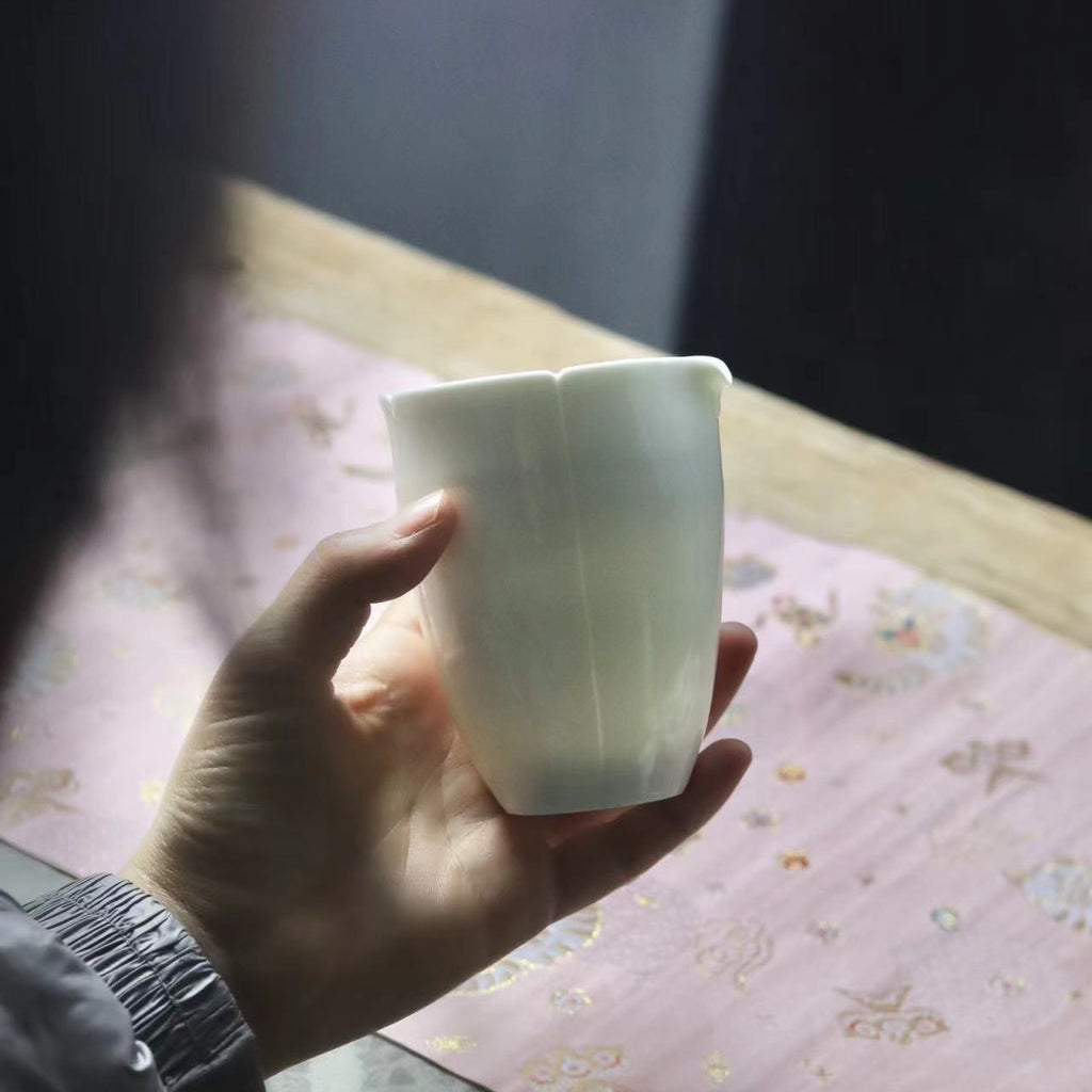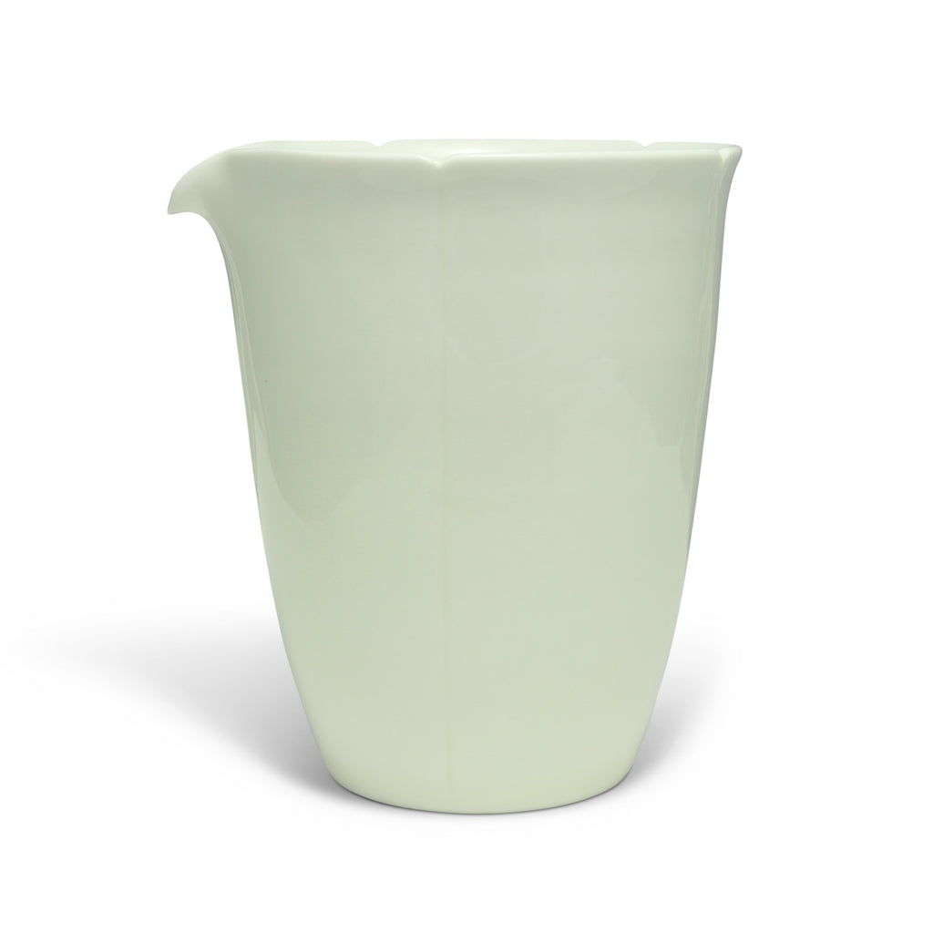 This elongated pitcher with a silky-smooth, just off-white glaze feels extremely comfortable in the hand. A careful, tapering shaping has kept the base thicker and more insulating while the thin rim appears more refined and offers good pour control. With merely four thin lines up the side terminating in hand-cut notches, the artist has transported a classical motif into a simplified vernacular—the mouth meant to evoke an opening sunflower—to allow pairing with both ornate and minimal teaware.