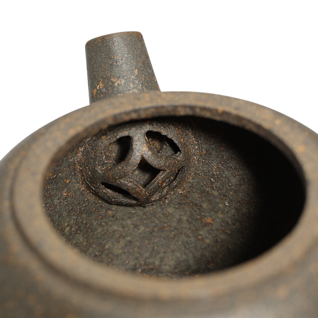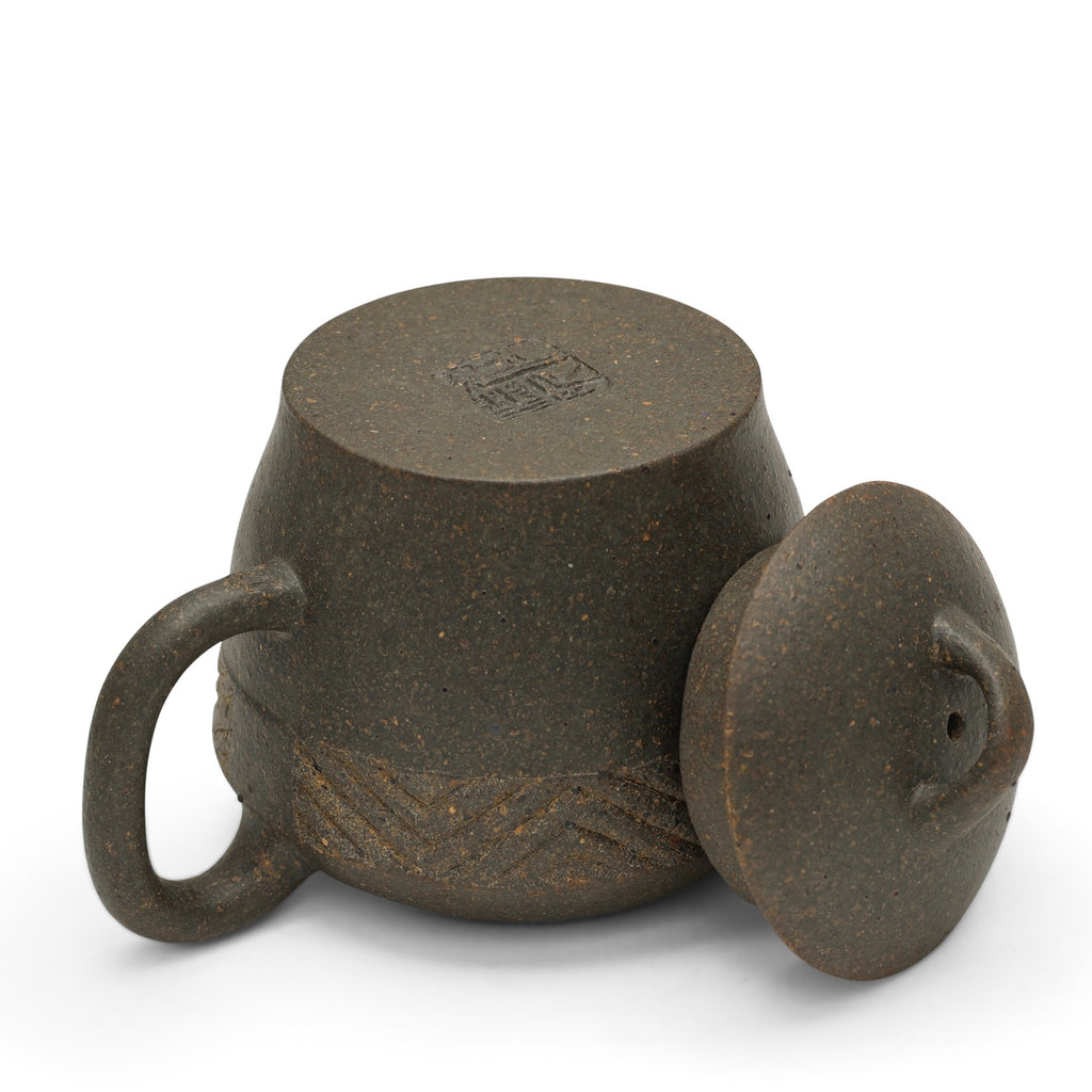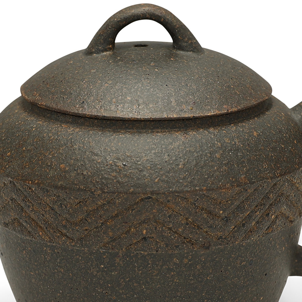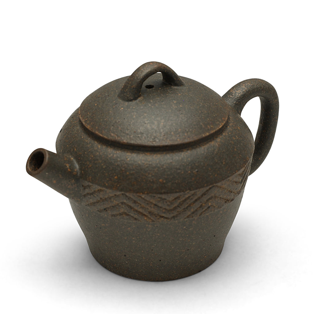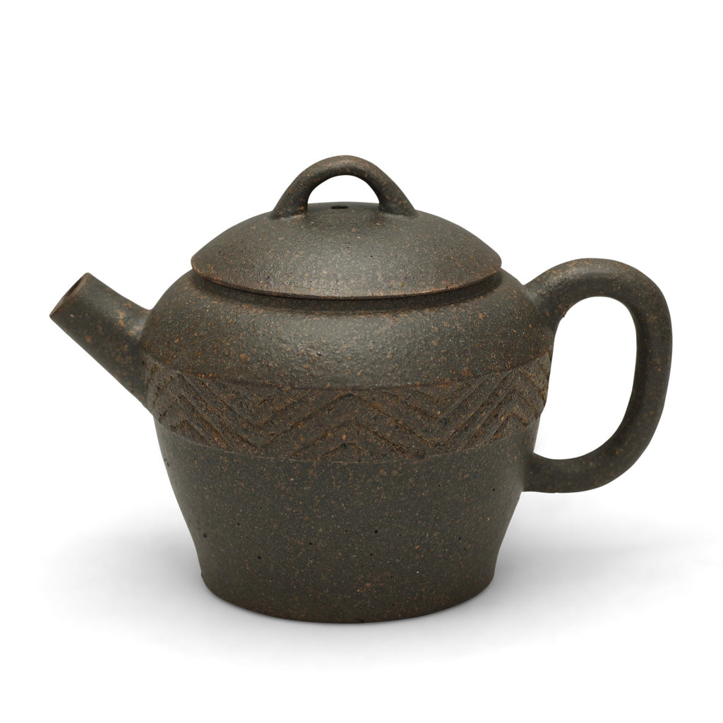 This exclusive teapot design was commissioned by us from the artist directly, yet could have been a thousand years old: A bell-like profile, reminiscent of early utilitarian pottery, is paired with a domed lid, thick spout, elongated handle and matching arched knob, and, most notably, a carved design in bas-relief ringing the body. We visited Master Ren Yi-Xin in his Yixing atelier, sketching the profile and pattern we wanted and selecting the ore together, specifically requesting a small volume with a large spout. The simple, geometric zig-zags are traditional motifs that symbolize 'water' and 'continuity', lending an archaic flare to the piece, especially when exposing the textured ore. The teapot allows placing large leaves in the wide mouth, flash brewing with a high leaf-to-water ratio, and a quick pour, filtered by a built-in net filter, designed especially for our gongfu-loving customers. Among all of the rare and distant finds on our shop, this is one we can guarantee you won't find anywhere else.