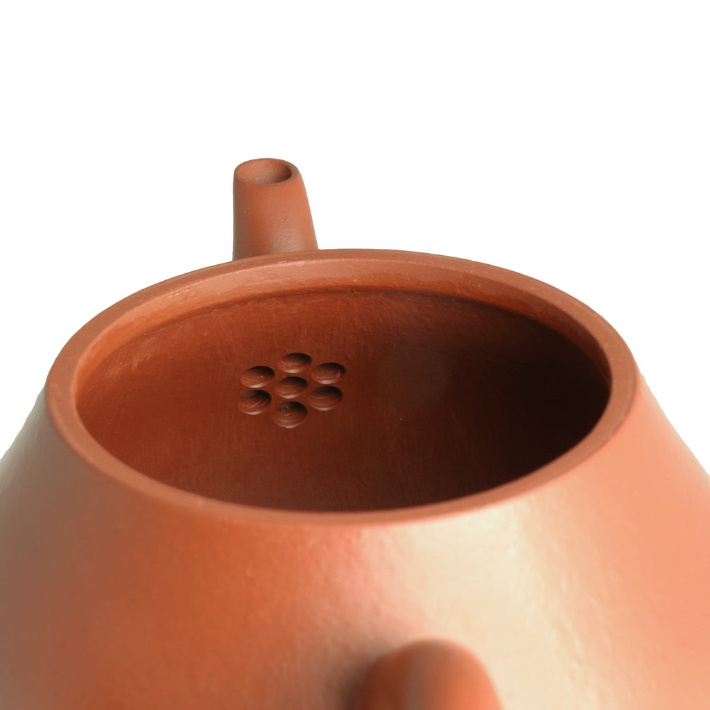 With bowed-out sides, as if barely containing an eagerness to dispense the tea within, this Yixing elongates upward. While static, the form from above resembles the classic oil lamp hovering above the table. But it really shines when in motion, its near-symmetries shifting the appearance at different angles, and its lustrous curvature catching the light. Among the more miniature of teapots, its smooth surface, thin walls, and built-in net filter promise a pleasure optic, haptic, and gustatory in its use.