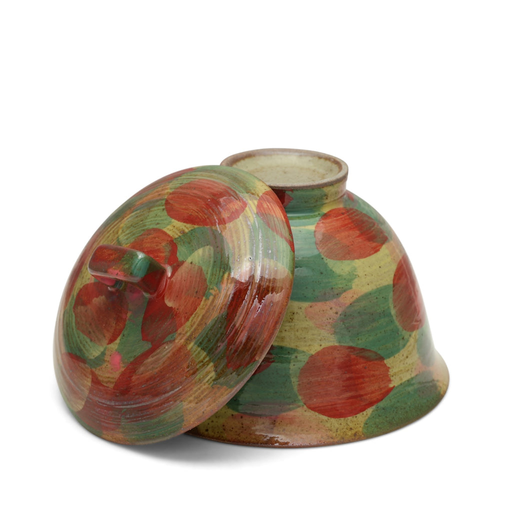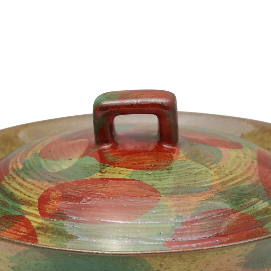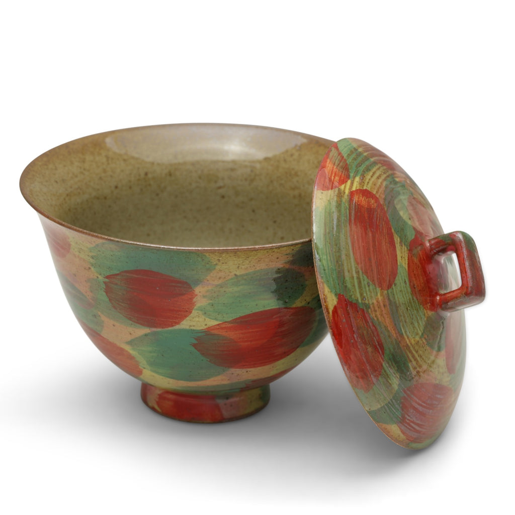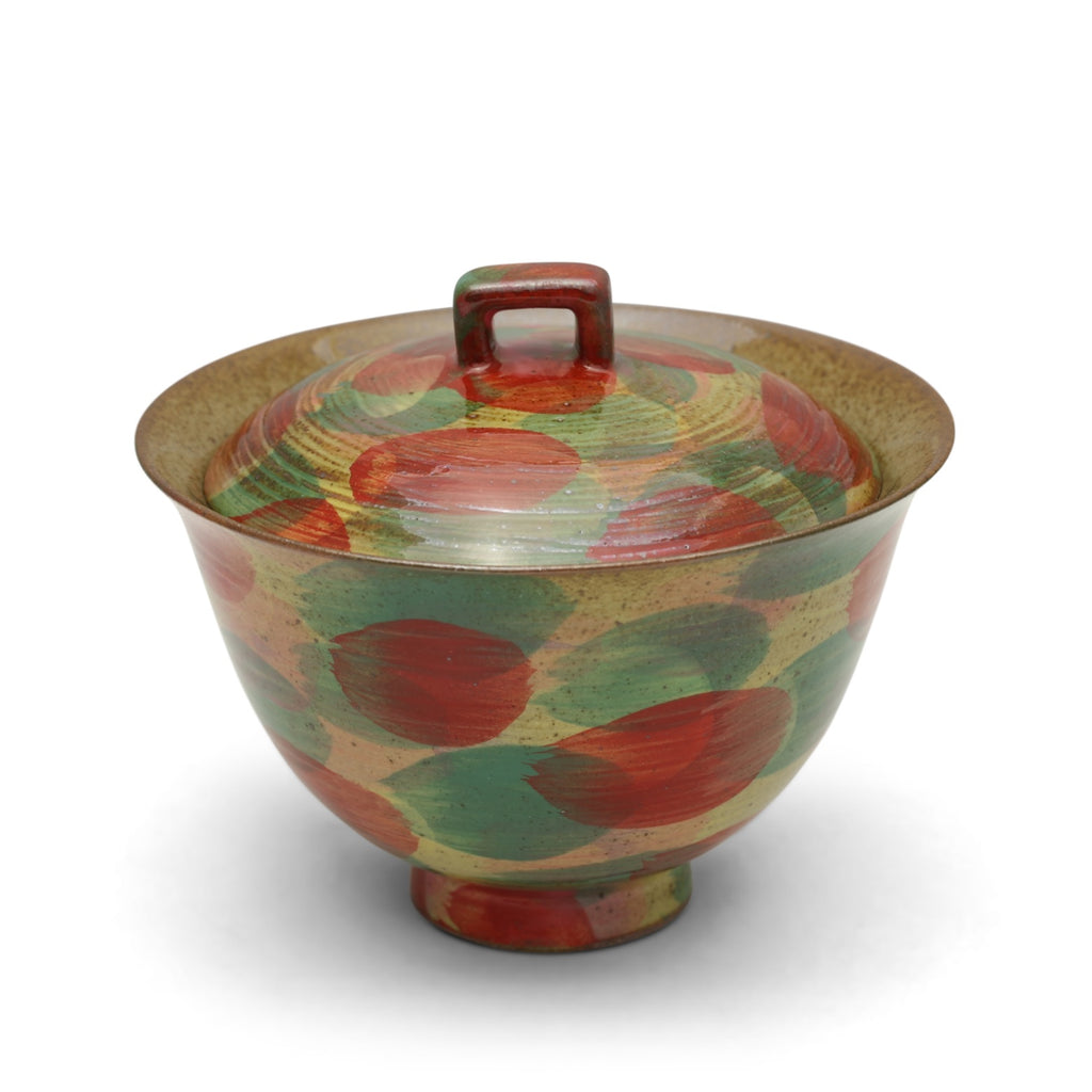 This gaiwan is a vibrant masterpiece that invites you into a world of playful sophistication. Its form resembles a delicate bell, as if a cheerful artisan captured its melody and painted it with bold brushstrokes of red and green. The vibrant patterns evoke the warmth of autumn leaves or a flourishing garden, while the textured, speckled background adds an earthy charm, grounding its lively energy. The lid's square handle adds a modern flair, seamlessly blending practicality with artistry. More than just a tea vessel, it’s a celebration of creativity and craftsmanship, bringing joy and delight to every brew.