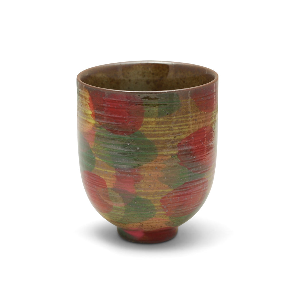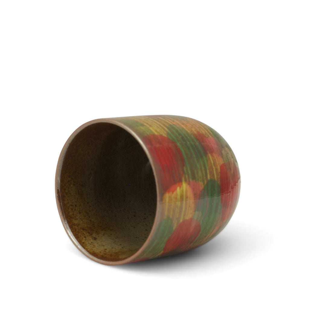 This delicate cup radiates playful sophistication in an intimate form. Its rounded shape is alive with bold brushstrokes of red, green, and gold, reminiscent of autumn leaves caught in a gentle swirl. The textured surface, with its speckled and earthy undertones, adds depth and warmth, grounding the cup’s lively energy. While small and compact, its radiant palette makes it not just a vessel for tea, but a celebration of color and craftsmanship, perfect for savoring small moments of joy.