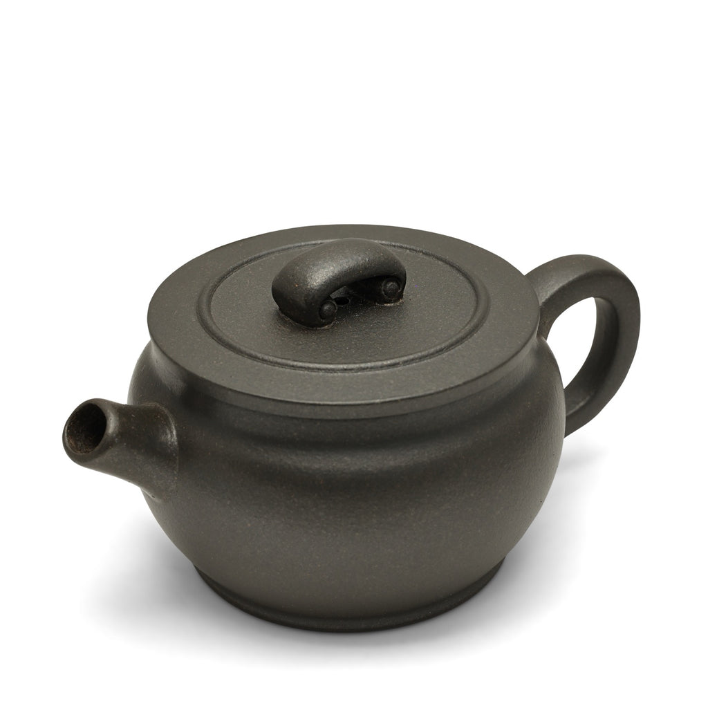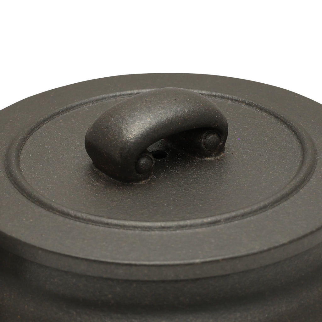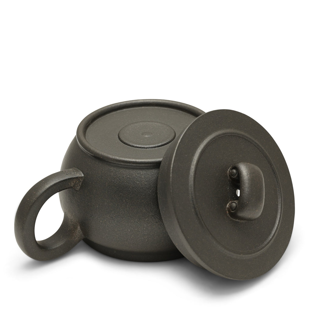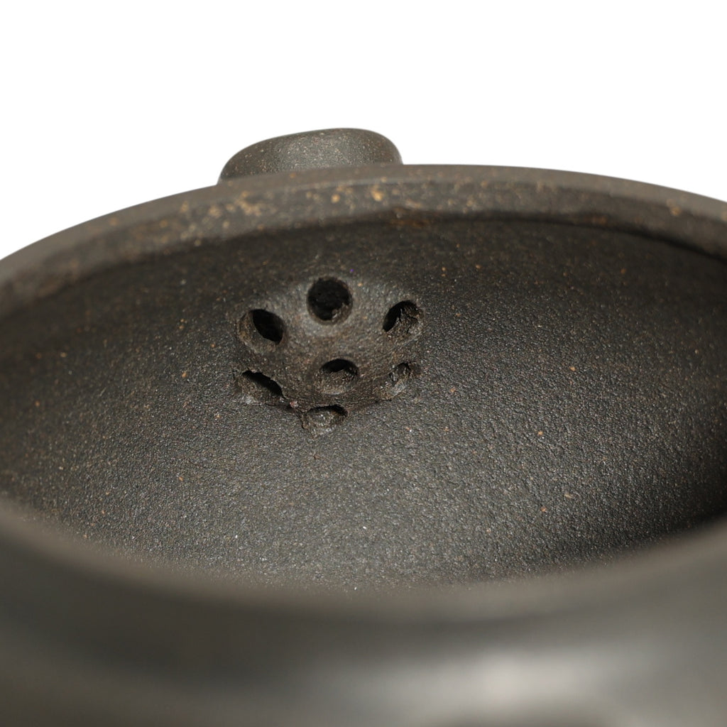What truly sets this piece apart is its deep, charcoal-black hue—achieved through huan yuan shao (还原烧), or reduction firing. This specialized kiln atmosphere reduces oxygen during the firing process, transforming the natural reddish-brown tone of zini (紫泥) into this subtle, smoky black while preserving the clay’s distinctive speckled texture.
