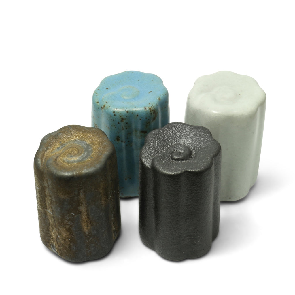 These cute lid holders are made of dark, rough clay in a variety of glazes. The little pedestal in the shape of a seven-petaled flower has a flat enough surface to balance the lid of a gaiwan, teapot, or infusing mug. When pouring fresh hot water in the brewing vessel or inhaling deeply the fragrance of the moist leaves within, the lid may thereby be floated regally (and hygienically) above the tea table, while it enhances the aesthetics of the cha xi when not in use. It's one of those accessories that, while not necessary to the strict minimalist, seasons the enjoyment of the tea-making practice.