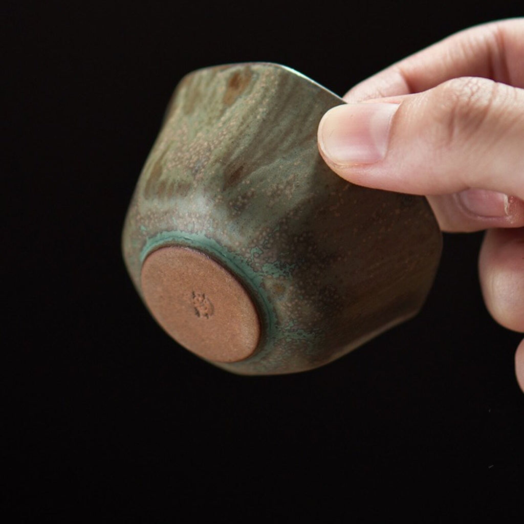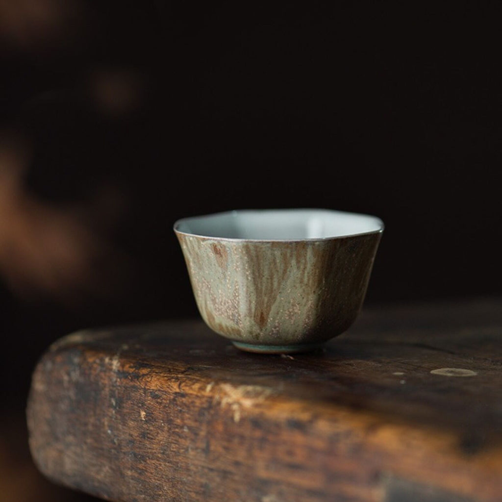 These glazed octagonal cups have the distinction of being selected by our Discord community while we were sourcing teaware in China. The 'eggshell' style is unusual for non-porcelain ceramic, as one can see from ruddy brown material exposed on the foot, and the thin walls tapering to a mere couple millimeters is not only impressive, but keeps the cups airy light in the hand. The soft octagon with its slightly textured exterior glaze adds to the haptics, while the cool off-white interior glaze shows off the color of the infusion beautifully, making these the perfect everyday gongfu cups for those who prefer color and texture to pure white ceramic.