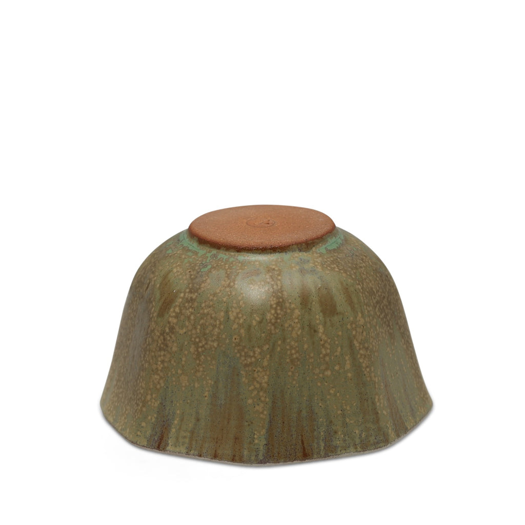 The stony gray glaze is mottled with pinpricks of chalky brown, splashes of lichen-like teal, and tinges of rust, pairing well with natural materials and belying its minimal weight.