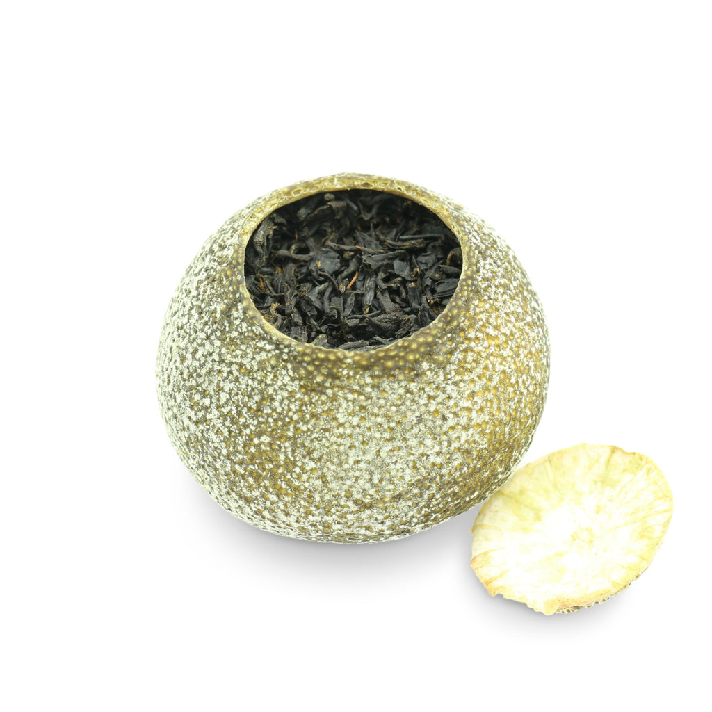 Though one could attempt to drop the whole mandarin in a gaiwan or teapot, better results may be obtained by (carefully) cracking the peel open, so that the tea inside can better be exposed. Having been packed inside the mandarin, the tea has absorbed some of its aroma and can be used alone, but including pieces of the peel offers a special and tasty experience. Play around with proportions! It is not recommended to use this tea with open clay teaware (e.g. Yixing, Chaozhou clay), as the pungent oils may be absorbed and flavor all subsequent teas, unless this happens to be expressly desired.